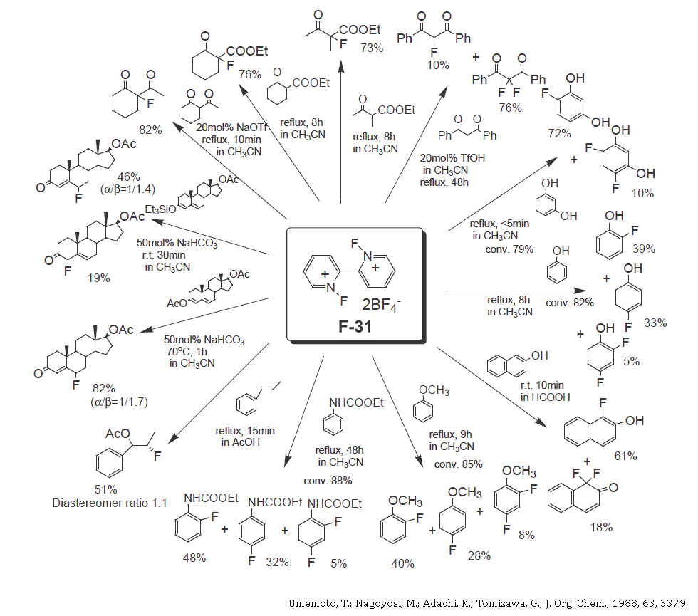 • Easy to remove another product, 2,2′-Bipyridinium bis(tetrafluoroborate) form the fluorination products, as it dissolves in diluted hydrochloric acid.