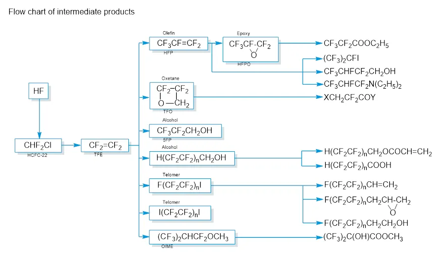 DAIKIN Industries produces and offers wide ranged intermediates through an integrated production system that starts with hydrofluoric acid.
